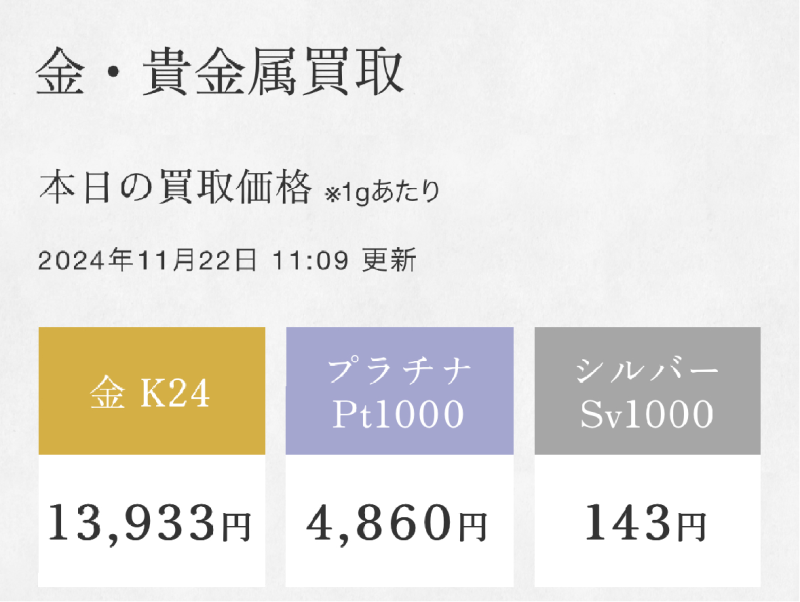 11月22日の貴金属(金、銀、プラチナ)の買取価格です✨✨